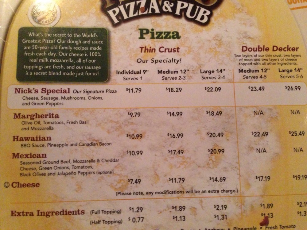 Nick's Pizza & Pub in Elgin, IL is a pizza joint that offers a variety of delicious options for pizza lovers. With amenities like delivery, takeout, reservations, and wheelchair accessibility, Nick's ensures a convenient dining experience. The menu boasts many vegetarian options, making it a great choice for vegetarians. The casual setting with moderate noise levels is perfect for a laid-back meal. From the Awesome Blossoming Onion to the Bacon Cheddar Fries and Beer Battered Onion Rings, the munchies section offers tempting starters. The Caesar Salad and Nick's English Pub Style FishNChips are house specialties worth trying. With a full bar, free Wi-Fi, and outdoor seating available, Nick's Pizza & Pub is a great spot for groups, families, and even kids. Don't miss out on the flavorful dishes and friendly atmosphere at Nick's Pizza & Pub.